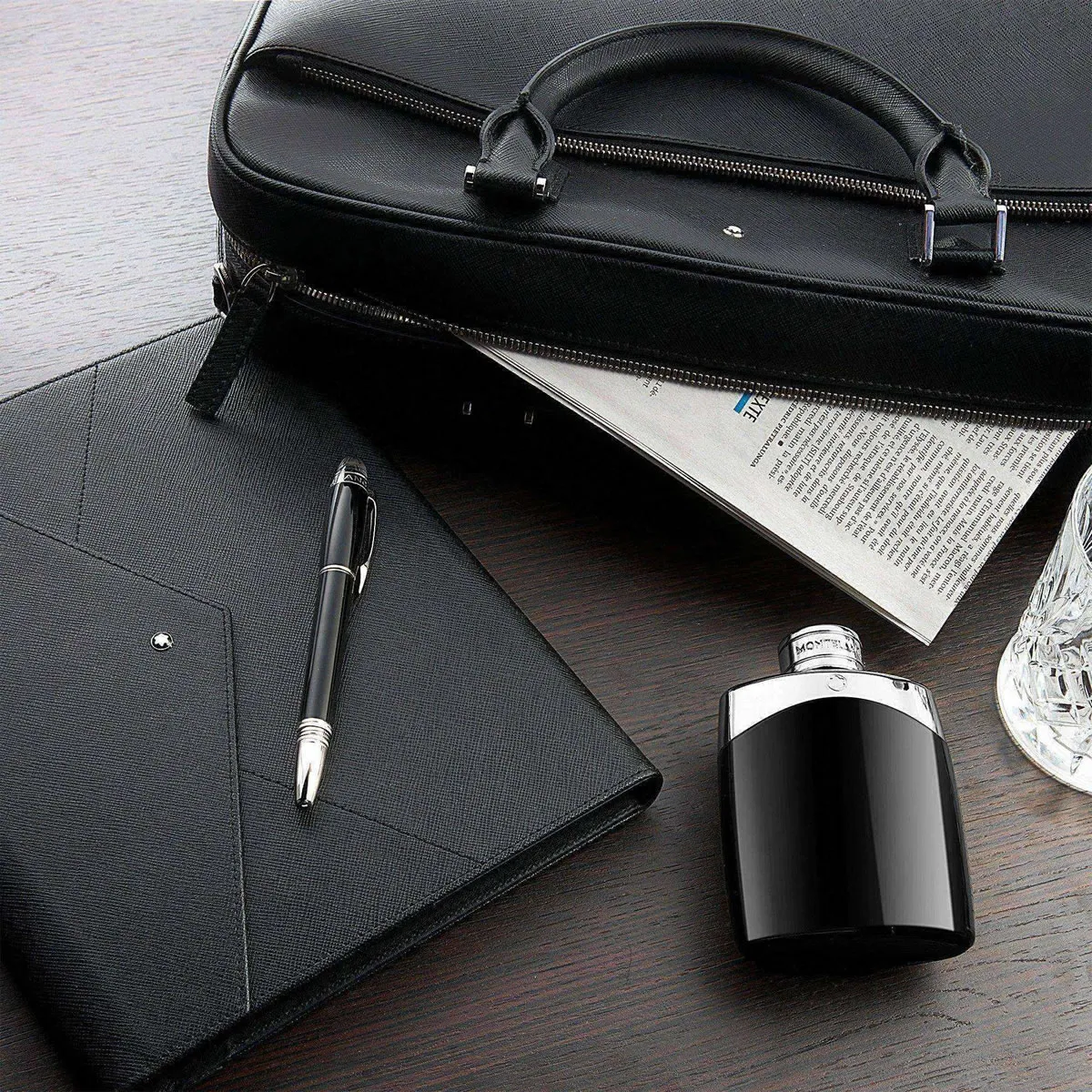 - Heavy and slightly curved bottle of black and metallic colors is inspired by the famous Meisterstück pen design, made of glass and metal